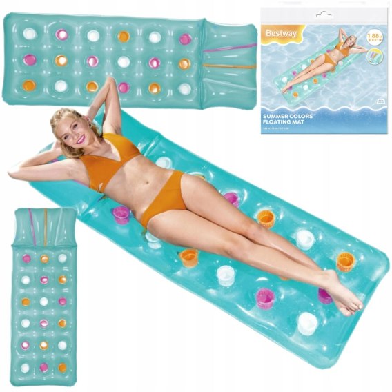 Materac do pływania firmy Bestway to idealne rozwiązanie na letni wypoczynek nad morzem, jeziorem w basenie czy we własnym ogrodzie. Dmuchany materac wykonany jest z wytrzymałego materiału PCV, który posłuży przez klika lat. Charakterystyczną cechą nadmuchiwanego materaca jest zagłówek zapewniający komfort i stałe zanurzenie w orzeźwiającej wodzie. Materac do pływania to wspaniała propozycja dla osób ceniących wygodę i relaks na świeżym powietrzu.