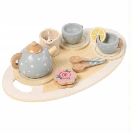W zestawie jest wszystko, co trzeba: taca, czajniczek z pokrywką, filiżanki, spodki, łyżeczki, ciastka i cytrynka - czyli komplet na „prawdziwą" herbatkę.