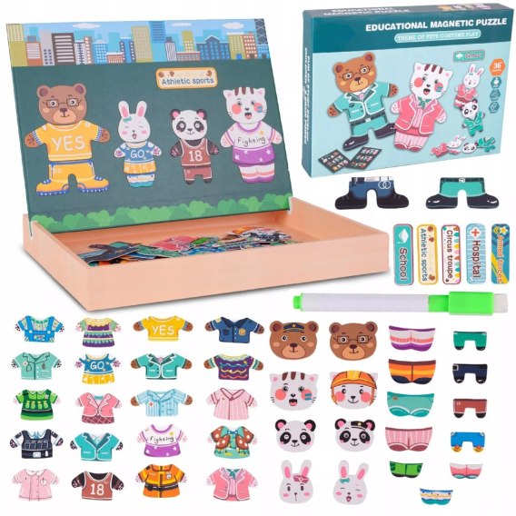 - W zestawie: tablica magnetyczna, skrzyneczka, 3 karty z ubrankami/zwierzątkami/napisami, kartka z przykładowymi wzorami, mazak