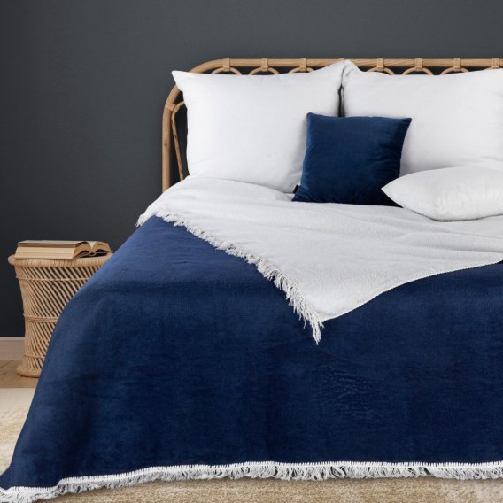 Koc akryl dwukolorowy z frędzlami szerokość: 220 cm, długość: 240 cm, kolor: biały, Gramatura: 450 GSM GSM, Skład: 58% bawełna, 32% akryl, 10% poliester