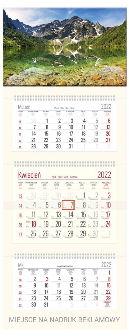 Format 380 x 990 mm, format główki 380 x 240, druk kolorowy, foliowana, kaszerowana, kalendarium 3 x 12 plansz, papier kalendarium offset 80g, zasadnicze kremowe, pomocnicze białe, druk kalendarium 2 kolory, podkład kremowy, oprawa spiralna o-wire, pole