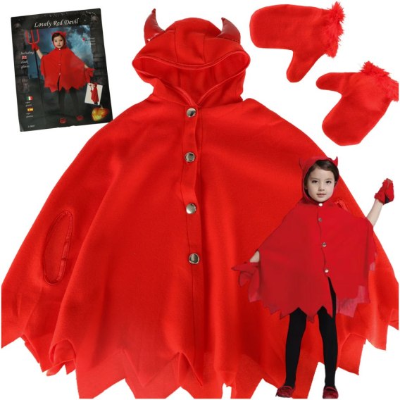 Czerwona peleryna jest wykonany z przyjemnego w dotyku materiału i jak tak uszyty, aby zapewnić swobodę ruchów, umożliwiając dziecku zabawę. Zapinana jest na cztery zatrzaski i ma kaptur z rogami. Rękawiczki mają puszek na brzegu, co stanowi interesujący akcent.