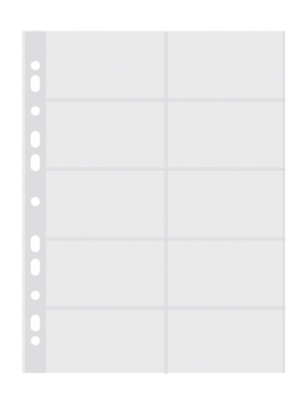 Wykonane z gładkiej ekologicznej folii polipropylenowej o grubości 60_m_specjalnie wzmocniony brzeg_antystatyczne_krystaliczne, transparentne_przeznaczone na 10 jednostronnie lub 20 dwustronnie umieszczonych kart wizytowych_kieszonki mieszczą wizytówki o rozmiarach do 95x60mm_ilość dziurek do wpięcia: 11_wymiar zewnętrzny: 225x308mm_wyprodukowane w fabryce posiadającej certyfikat kontroli jakości GB/T 19001-2016/ISO 9001:2015_kolor transparentny