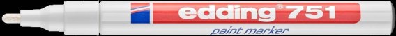 Marker lakierowy Edding 751_- marker lakierowy przeznaczony do wykonywania trwałych oznaczeń na niemal każdej powierzchni, także porowatej_- tusz pigmentowy, dobrze kryjący i wysoce nieprzezroczysty, wodoodporny i szybkoschnący, odporny na ścieranie, odporny na działanie temperatury do 400_C (kolory: biały, żółty i srebrny do 1000_C)_- tusz o nieagresywnym zapachu i kryciu zbliżonym do lakieru, nie zawiera toluenu i ksylenu_- marker posiada system kontroli dopływu tuszu do końcówki_- aluminiowa obudowa_- okrągła końcówka_- grubość linii pisania: 1-2 mm (751)_- jednostka sprzedaży 1 sztuka