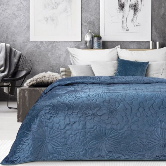 Klasyczna i bardzo elegancka narzuta na łóżko z miękkiego welwetu pikowana w modny motyw łuski. Pikowania wykonane metodą bezszwową hotpress. szerokość: 170 cm, długość: 210 cm, kolor: niebieski, Gramatura: 180+70+100 GSM, Skład: 100% poliester