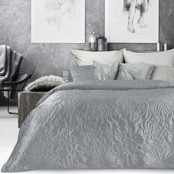 Klasyczna i bardzo elegancka narzuta na łóżko z miękkiego welwetu pikowana w modny motyw łuski. Pikowania wykonane metodą bezszwową hotpress. szerokość: 200 cm, długość: 220 cm, kolor: stalowy, Gramatura: 180+70+100 GSM, Skład: 100% poliester