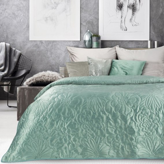 Klasyczna i bardzo elegancka narzuta na łóżko z miękkiego welwetu pikowana w modny motyw łuski. Pikowania wykonane metodą bezszwową hotpress. szerokość: 200 cm, długość: 220 cm, kolor: turkusowy, Gramatura: 180+70+100 GSM, Skład: 100% poliester