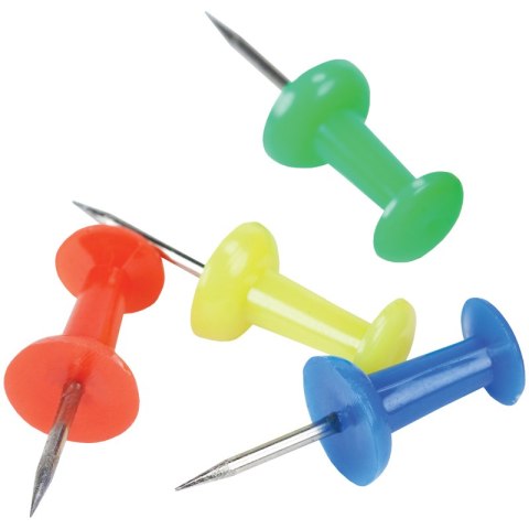 Pinezki beczułki wymiar wysokość 24mm, średnica 5mm, długość igły 12 mm. Ilość w opakowaniu 50 szt. Różne kolory. Służą do oznaczeń na mapach, wykresach oraz do dołączania informacji do tablic korkowych. Pakowane w zamykane plastikowe pudełko z zawieszką euro.