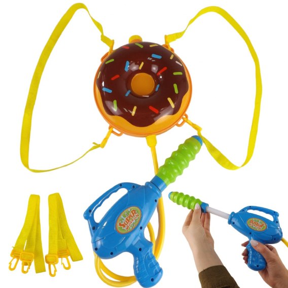 Pistolet z plecakiem w kształcie brązowego pączka z posypką jest bardzo łatwy w obsłudze. Odkręć pojemnik na wodę (plecak) i napełnij go, aby wydobyć wodę z pistoletu przesuwaj pompę do przodu i do tyłu. Woda będzie wydobywała się z pistoletu pod ciśnieniem. Zdziwisz się jaki woda ma daleki zasięg.