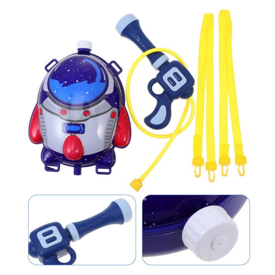 Zaopatrz się w pistolet na wodę z plecakiem w kształcie niebieskiej rakiety i baw się dobrze na swoim podwórku podczas bitwy wodnej.