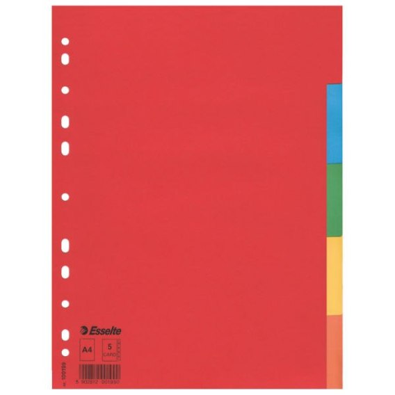 Przekładki Esselte z kolorowego kartonu_- Przekładki i indeksy w 5 kolorach; bez karty opisowej. _- Multiperforowane _ pasują do każdego segregatora._- Z kartą lub bez karty informacyjno-opisowej. _- Wykonane z mocnego kartonu 160 gsm._- jednostka sprzedazy 1 opakowanie