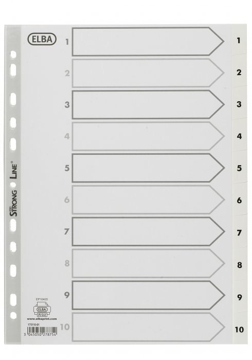 Przekładki numeryczne Strong Line wykonane są z mocnego i elastycznego polipropylenu 120_ w kolorze białym. Zastosowana uniwersalna europerforacja pozwoli na użycie przekładek segregatorze, a dodatkowa strona informacyjno-opisowa zapewni możliwość opisania produktu. Specjalne wzmocnienie perforacji strony opisowej STRONG LINE podniesie trwałość i odporność na zniszczenia produktu. Dodatkowym atutem jest możliwość personalizacji za pomocą aplikacji www.elbaprint.com.