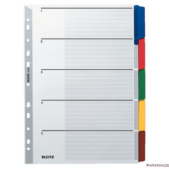 Przekładki kartonowe Leitz_- format A4 z mocnego kartonu 160 g/m__- kolorowe indeksy i perforacja wzmocniona folią_- multiperforowane - pasują do każdego segregatora_- z kartą informacyjno - opisową_- jednostka sprzedaży 1 komplet