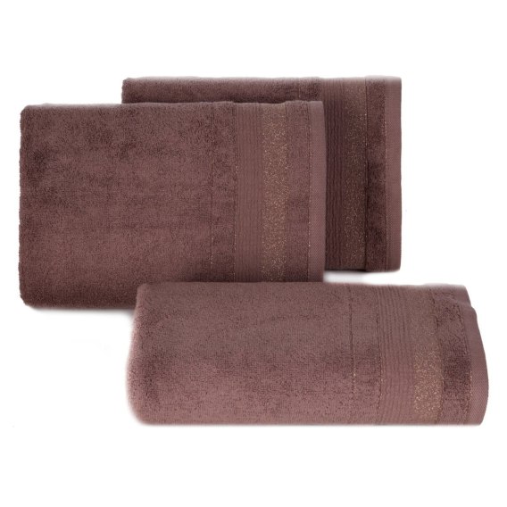 Ręcznik bawełniany z żakardową bordiurą z błyszczącą nicią szerokość: 30 cm, długość: 50 cm, kolor: jasnobrązowy, Gramatura: 500 GSM, Skład: 100% bawełna; część ozdobna: 95% bawełna, 5% poliester