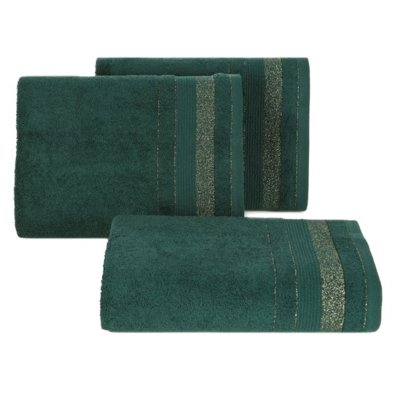 Ręcznik bawełniany z żakardową bordiurą z błyszczącą nicią szerokość: 30 cm, długość: 50 cm, kolor: ciemnozielony, Gramatura: 500 GSM, Skład: 100% bawełna; część ozdobna: 95% bawełna, 5% poliester