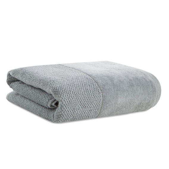 Ręcznik bawełniany z welurową bordiurą i błyszczącą nicią szerokość: 50 cm, długość: 90 cm, kolor: srebrny, Gramatura: 550 GSM, Skład: 100% bawełna; część ozdobna: 97% bawełna, 3% poliester