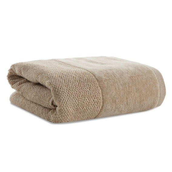 Ręcznik bawełniany z welurową bordiurą i błyszczącą nicią szerokość: 50 cm, długość: 90 cm, kolor: beżowy, Gramatura: 550 GSM, Skład: 100% bawełna; część ozdobna: 97% bawełna, 3% poliester