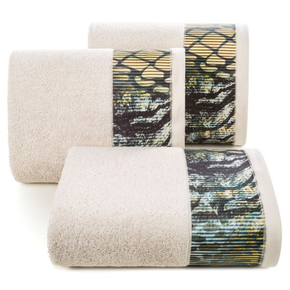 Ręcznik z drukowaną bordiurą szerokość: 70 cm, długość: 140 cm, kolor: beżowy, Gramatura: 500 GSM, Skład: 100% bawełna; 96% bawełna 4% poliester