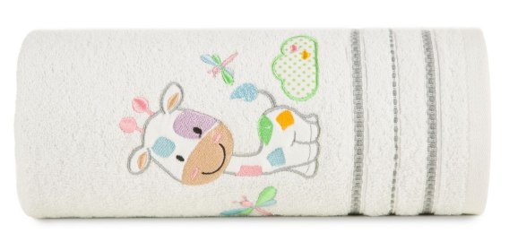 Mięciutki i bardzo delikatny dziecięcy ręcznik kąpielowy z chłonnej tkaniny frotte z naturalnej bawełny. Ręcznik zdobiony aplikacją jest łatwy w praniu. szerokość: 70 cm, długość: 140 cm, kolor: biały, Gramatura: 450 GSM, Skład: 100% bawełna