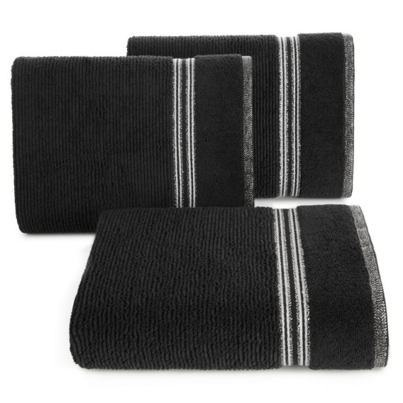 Bardzo puszysty i wyjątkowo chłonny ręcznik z bawełny frotte o strukturze delikatnych prążków. Bordiura w ciemniejszym kolorze z dodatkiem lśniącej nitki. szerokość: 70 cm, długość: 140 cm, kolor: czarny, Gramatura: 530 GSM, Skład: 100% bawełna; część ozdobna: 97% bawełna, 3% poliester