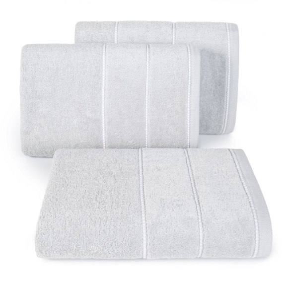 Ręcznik z ozdobną welurową bordiurą w pasy szerokość: 30 cm, długość: 50 cm, kolor: srebrny, Gramatura: 500 GSM, Skład: 100% bawełna; część ozdobna: 60% bawełna, 40% poliester