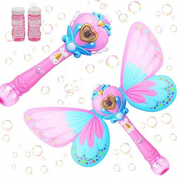 Różdżka motyl do robienia baniek to świetny gadżet dla naszych księżniczek, który tworzy dużo kolorowych baniek! Wystarczy wlać płyn do przeznaczonego do tego miejsca u podstawy różdżki, nacisnąć przycisk w kształcie serca i różdżka motyl zacznie wydmuchiwać ogromną ilość kolorowych baniek.