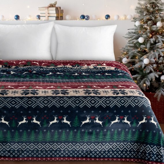 Świąteczny koc typu flano z ozdobnym nadrukiem szerokość: 150 cm, długość: 200 cm, kolor: granatowy, Gramatura: 240 GSM, Skład: 100% poliester