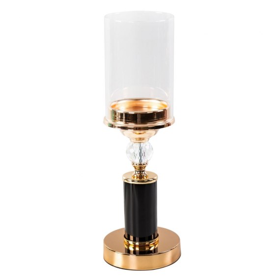 Świecznik dekoracyjny ze szklanym kloszem szerokość: fi 12 cm, długość: 37 cm, kolor: złoty, Skład: metal, szkło