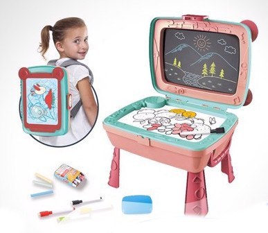 - W zestawie znajdują się paski, dzięki którym można przekształcić tablicę w plecak. Plecak zamykany jest na zatrzask, dzięki czemu wszystkie akcesoria oraz inne rzeczy, które również zmieszczą się do środka, można w nim bezpiecznie przenosić. Z zewnątrz znajduje się przezroczysta tablica, gdzie dziecko może eksponować swój ulubiony narysowany przez siebie lub kogoś innego, obrazek.