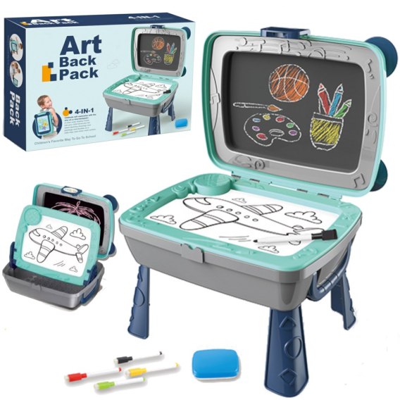 Wszystkie dzieci uwielbiają rysować. Tablica umożliwia tworzenie pięknych obrazków za pomocą kredy lub mazaków. Tablicę może wykorzystać na klika możliwości. Jedną z nich jest otwierany stolik, który posiada wbudowaną stronę kredową, natomiast magnetyczną cześć można zamocować w pozycji poziomej lub ukośnej. W zestawie dołączone są paski, przez co możemy przekształcić ją w plecak. Plecak posiada zatrzask, dzięki czemu akcesoria nie zagubią się podczas podróży. Z przodu plecaka znajduje się miejsce do przechowywania naszych artystycznych prac.