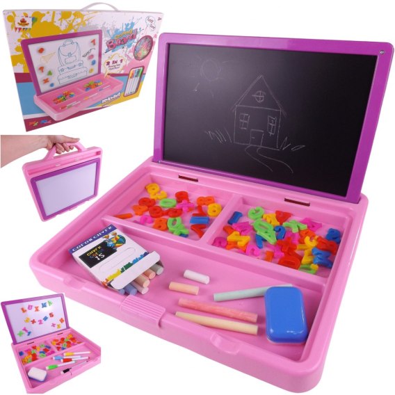 Wszystkie dzieci uwielbiają rysować. Tablica umożliwia tworzenie pięknych obrazków za pomocą kredy lub mazaków. Tablica została zaprojektowana w kształcie podręcznej walizki. Podstawą tablicy jest skrzynka, która posiada przegródki do przechowywania akcesoriów zestawuNa Czarnej tradycyjnej stronie można pisać, rysować załączoną do zestawu kredą. Natomiast biała warstwa przeznaczona jest do malowania mazakiem sucho ścieralnym. Zarówno tablicę kredową, jak i magnetyczną, można łatwo czyścić, używając załączoną do zestawu gąbką. Do białej magnetycznej strony można również przyczepiać swoje notatki lub obrazki za pomocą dołączonych magnesów. Magnesy są w kształcie literek i cyferek, razem aż 52 sztuki. Dzięki nim dziecko pozna świat alfabetu , zapozna się z kształtami liter oraz cyfr. Również Dzięki możliwości używania magnesów, tablica świetnie posłuży do interaktywnej nauki poprzez tworzenie podstawowych działań matematycznych.