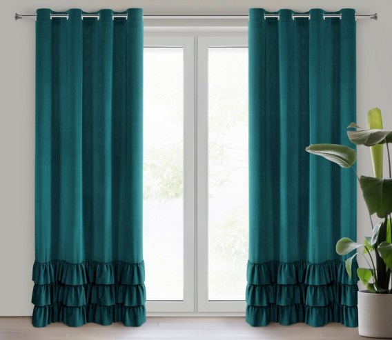 Zasłony z tkaniny welwetowej zdobione w górnej części 3 falbanami szerokość: 140 cm, długość: 250 cm, kolor: ciemnoturkusowy, Skład: 100% poliester