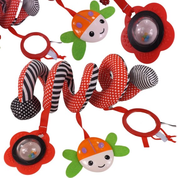 - Kontrastowa spirala, którą z łatwością owiniesz wokół uchwytu z fotelika samochodowego, szczebelków łóżeczka, pałąku w wózku.