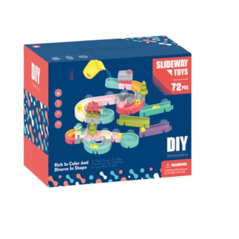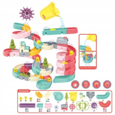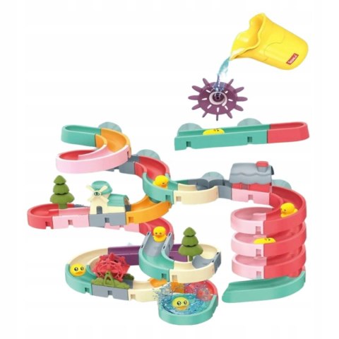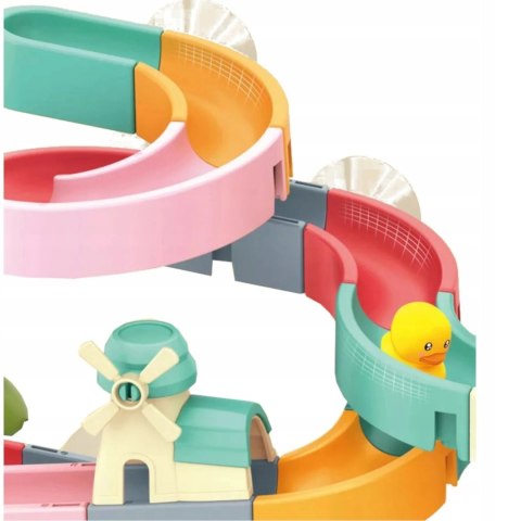 Tor wodny do kąpieli to idealna zabawka dla dzieci uwielbiających zabawy podczas wieczornej higieny. W zestawie znajduje się 40 elementów do budowy różnych kombinacji toru, po których będą ścigać się kaczuszki, fasolki i kuleczki. Dodatkowym uatrakcyjnieniem jest kręcący się kołowrotek, polany wodą obraca się wokół własnej osi. Aby tor mógł zostać zamocowany do płytek lub wanny  zestaw został wyposażony w 17silikonowych przyssawek, które utrzymują zjeżdżalnie na miejscu. Kaczki, które zakończyły już zjazd i wylądowały w wodzie można wyławiać za pomocą kubeczka załączonego do zestawu.