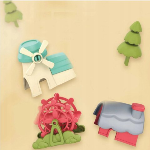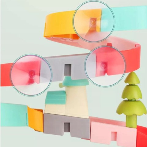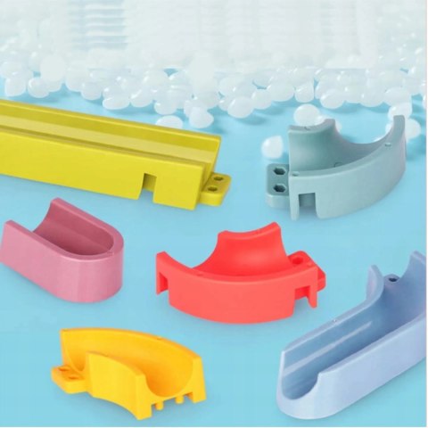 Aż 40 plastikowych elementów toru, pozwalające na budowanie przeróżnych tras i kombinacji zjeżdżalni.
