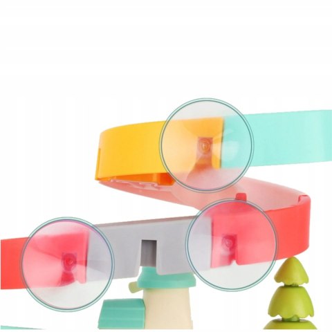 Ułożony tor przyczepia się do płytek, szyb kabiny prysznicowej lub nawet do wanny i jest nie tylko zabawką, ale będzie też kolorową ozdobą łazienki.