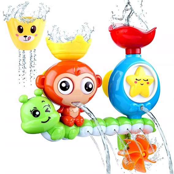 Zabawka wodna w kształcie małpki z gąsienicą i gwiazdką. Dziecko za pomocą dołączonego kubeczka wlewa wodę do czapki małpki, która w trakcie zabawy ma wirujące oczy i otwierającą się buzię, przez którą wypływa woda do wanny.