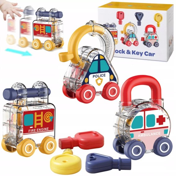 Zestaw 3 samochodzików Montessori kłódka klucze edukacyjna dla dzieci 18m+