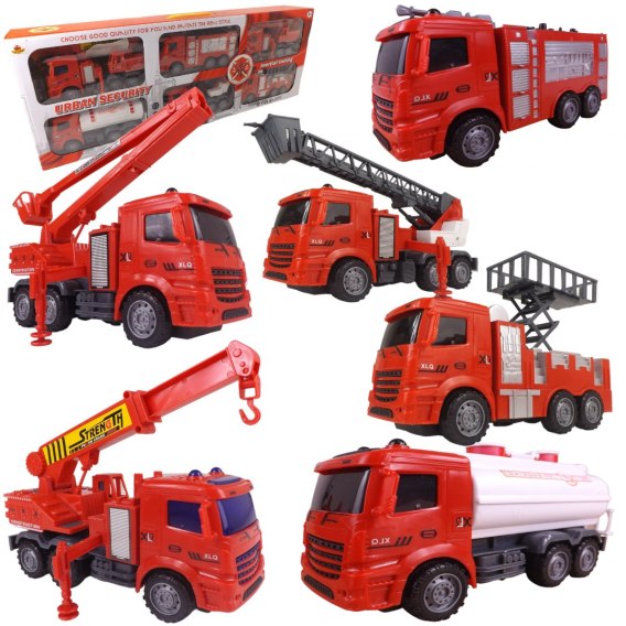 Każdy pojazd w zestawie jest inny i posiada indywidualne cechy. Wóz strażacki posiada ruchomą armatkę wodną. Dwie ciężarówki mają obracane platformy o 360° oraz wyciągane podnośniki, a cysterna ma dwa otwierane zbiorniki. Wszystkie elementy zestawu są w ładnej czerwonej kolorystyce charakterystycznej dla starzy pożarnej, zachęcając dzieci do zabawy w odgrywanie ról strażaków.